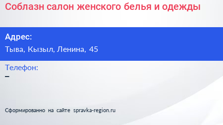 Соблазн, салон женского белья и одежды по адресу Тыва, Кызыл, Ленина, 45 в дальнейшем Организация, размещена в следующих категориях:
