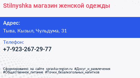 Stilnyshka, магазин женской одежды по адресу Тыва, Кызыл, Чульдума, 31 в дальнейшем Организация, размещена в следующих категориях: