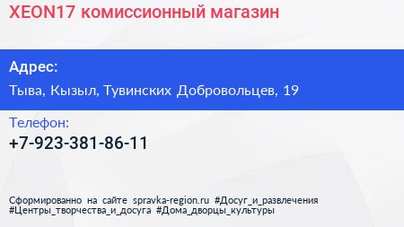 XEON17, комиссионный магазин по адресу Тыва, Кызыл, Тувинских Добровольцев, 19 в дальнейшем Организация, размещена в следующих категориях: