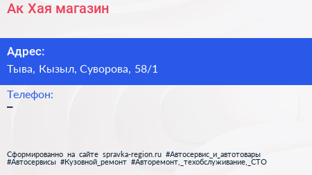Ак-Хая, магазин по адресу Тыва, Кызыл, Суворова, 58/1 в дальнейшем Организация, размещена в следующих категориях: