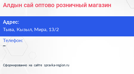 Алдын-сай, оптово-розничный магазин по адресу Тыва, Кызыл, Мира, 13/2 в дальнейшем Организация, размещена в следующих категориях: