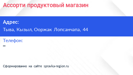 Ассорти, продуктовый магазин по адресу Тыва, Кызыл, Ооржак Лопсанчапа, 44 в дальнейшем Организация, размещена в следующих категориях: