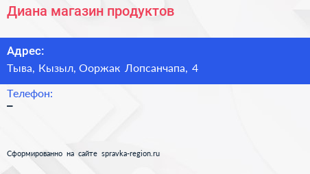 Диана, магазин продуктов по адресу Тыва, Кызыл, Ооржак Лопсанчапа, 4 в дальнейшем Организация, размещена в следующих категориях: