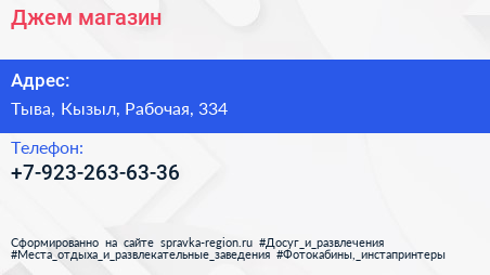 Джем, магазин по адресу Тыва, Кызыл, Рабочая, 334 в дальнейшем Организация, размещена в следующих категориях: