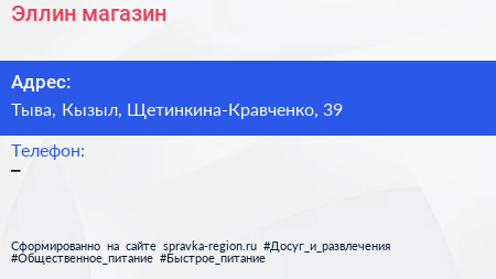 Эллин, магазин по адресу Тыва, Кызыл, Щетинкина-Кравченко, 39 в дальнейшем Организация, размещена в следующих категориях: