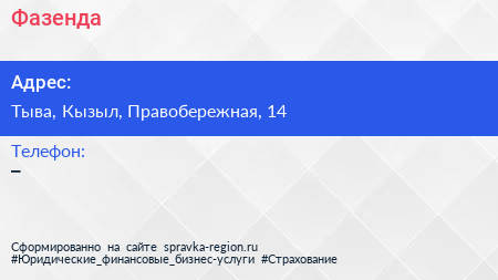 Фазенда по адресу Тыва, Кызыл, Правобережная, 14 в дальнейшем Организация, размещена в следующих категориях: