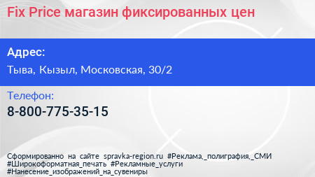 Fix Price, магазин фиксированных цен по адресу Тыва, Кызыл, Московская, 30/2 в дальнейшем Организация, размещена в следующих категориях: