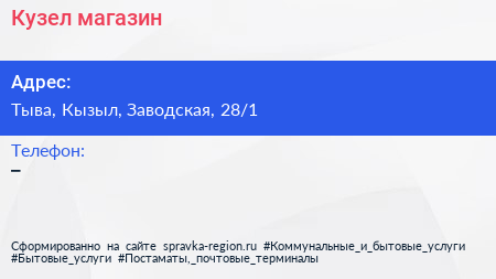 Кузел, магазин по адресу Тыва, Кызыл, Заводская, 28/1 в дальнейшем Организация, размещена в следующих категориях: