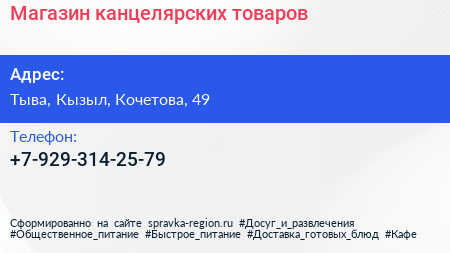 Магазин канцелярских товаров по адресу Тыва, Кызыл, Кочетова, 49 в дальнейшем Организация, размещена в следующих категориях: