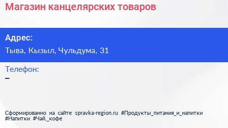 Магазин канцелярских товаров по адресу Тыва, Кызыл, Чульдума, 31 в дальнейшем Организация, размещена в следующих категориях: