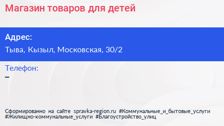 Магазин товаров для детей по адресу Тыва, Кызыл, Московская, 30/2 в дальнейшем Организация, размещена в следующих категориях:
