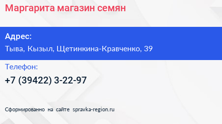 Маргарита, магазин семян по адресу Тыва, Кызыл, Щетинкина-Кравченко, 39 в дальнейшем Организация, размещена в следующих категориях: