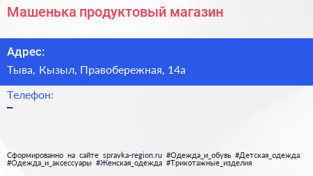 Машенька, продуктовый магазин по адресу Тыва, Кызыл, Правобережная, 14а в дальнейшем Организация, размещена в следующих категориях: