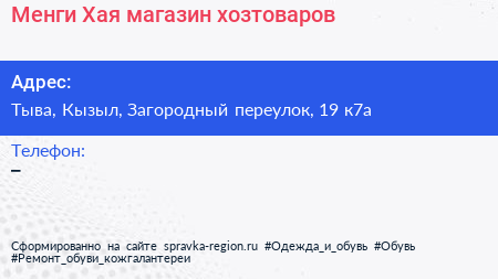 Менги-Хая, магазин хозтоваров по адресу Тыва, Кызыл, Загородный переулок, 19 к7а в дальнейшем Организация, размещена в следующих категориях: