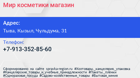 Мир косметики, магазин по адресу Тыва, Кызыл, Чульдума, 31 в дальнейшем Организация, размещена в следующих категориях:
