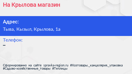На Крылова, магазин по адресу Тыва, Кызыл, Крылова, 1а в дальнейшем Организация, размещена в следующих категориях:
