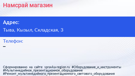 Намсрай, магазин по адресу Тыва, Кызыл, Складская, 3 в дальнейшем Организация, размещена в следующих категориях: