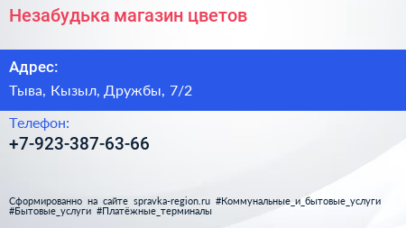 Незабудька, магазин цветов по адресу Тыва, Кызыл, Дружбы, 7/2 в дальнейшем Организация, размещена в следующих категориях: