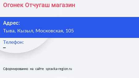 Огонек-Отчугаш, магазин по адресу Тыва, Кызыл, Московская, 105 в дальнейшем Организация, размещена в следующих категориях: