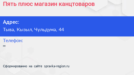 Пять плюс, магазин канцтоваров по адресу Тыва, Кызыл, Чульдума, 44 в дальнейшем Организация, размещена в следующих категориях:
