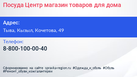 Посуда Центр, магазин товаров для дома по адресу Тыва, Кызыл, Кочетова, 49 в дальнейшем Организация, размещена в следующих категориях: