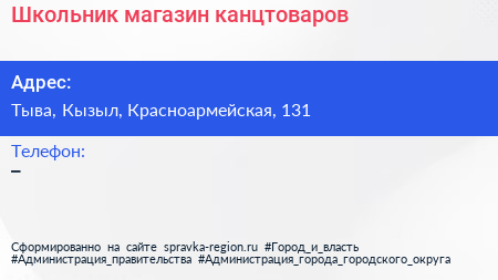Школьник, магазин канцтоваров по адресу Тыва, Кызыл, Красноармейская, 131 в дальнейшем Организация, размещена в следующих категориях: