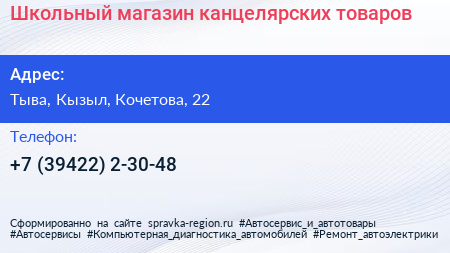 Школьный, магазин канцелярских товаров по адресу Тыва, Кызыл, Кочетова, 22 в дальнейшем Организация, размещена в следующих категориях: