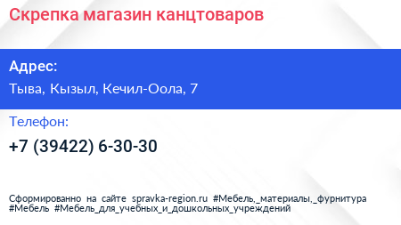 Скрепка, магазин канцтоваров по адресу Тыва, Кызыл, Кечил-Оола, 7 в дальнейшем Организация, размещена в следующих категориях: