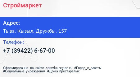 Строймаркет по адресу Тыва, Кызыл, Дружбы, 157 в дальнейшем Организация, размещена в следующих категориях: