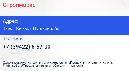 Строймаркет по адресу Тыва, Кызыл, Пушкина, 66 в дальнейшем Организация, размещена в следующих категориях: