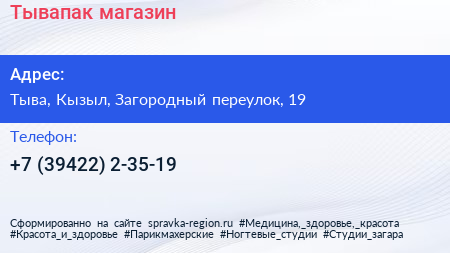 Тывапак, магазин по адресу Тыва, Кызыл, Загородный переулок, 19 в дальнейшем Организация, размещена в следующих категориях: