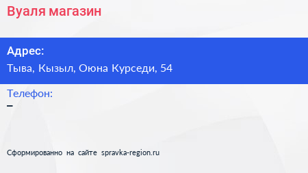 Вуаля, магазин по адресу Тыва, Кызыл, Оюна Курседи, 54 в дальнейшем Организация, размещена в следующих категориях: