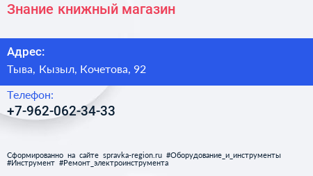 Знание, книжный магазин по адресу Тыва, Кызыл, Кочетова, 92 в дальнейшем Организация, размещена в следующих категориях: