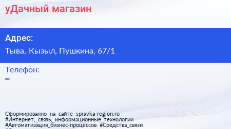 уДачный, магазин по адресу Тыва, Кызыл, Пушкина, 67/1 в дальнейшем Организация, размещена в следующих категориях: