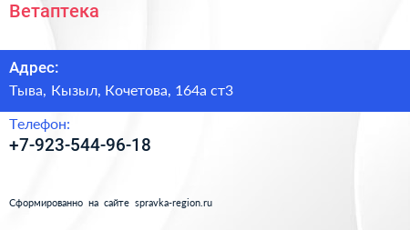 Ветаптека по адресу Тыва, Кызыл, Кочетова, 164а ст3 в дальнейшем Организация, размещена в следующих категориях: