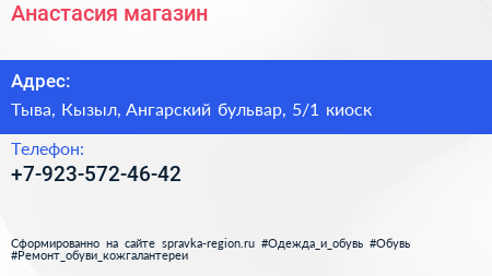 Анастасия, магазин по адресу Тыва, Кызыл, Ангарский бульвар, 5/1 киоск в дальнейшем Организация, размещена в следующих категориях: