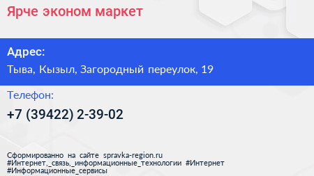 Ярче, эконом-маркет по адресу Тыва, Кызыл, Загородный переулок, 19 в дальнейшем Организация, размещена в следующих категориях: