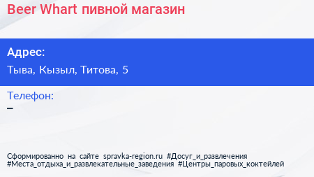 Beer Whart, пивной магазин по адресу Тыва, Кызыл, Титова, 5 в дальнейшем Организация, размещена в следующих категориях: