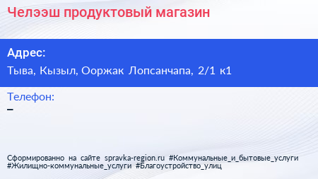 Челээш, продуктовый магазин по адресу Тыва, Кызыл, Ооржак Лопсанчапа, 2/1 к1 в дальнейшем Организация, размещена в следующих категориях: