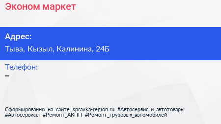 Эконом-маркет по адресу Тыва, Кызыл, Калинина, 24Б в дальнейшем Организация, размещена в следующих категориях: