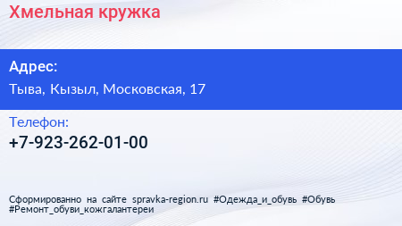 Хмельная кружка по адресу Тыва, Кызыл, Московская, 17 в дальнейшем Организация, размещена в следующих категориях: