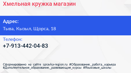 Хмельная кружка, магазин по адресу Тыва, Кызыл, Щорса, 18 в дальнейшем Организация, размещена в следующих категориях:
