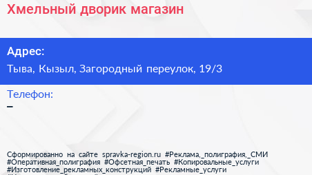 Хмельный дворик, магазин по адресу Тыва, Кызыл, Загородный переулок, 19/3 в дальнейшем Организация, размещена в следующих категориях: