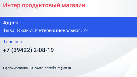 Интер, продуктовый магазин по адресу Тыва, Кызыл, Интернациональная, 74 в дальнейшем Организация, размещена в следующих категориях: