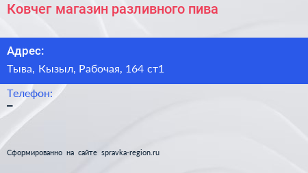 Ковчег, магазин разливного пива по адресу Тыва, Кызыл, Рабочая, 164 ст1 в дальнейшем Организация, размещена в следующих категориях: