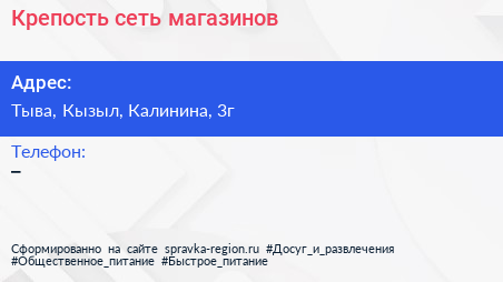 Крепость, сеть магазинов по адресу Тыва, Кызыл, Калинина, 3г в дальнейшем Организация, размещена в следующих категориях: