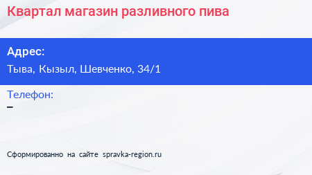 Квартал, магазин разливного пива по адресу Тыва, Кызыл, Шевченко, 34/1 в дальнейшем Организация, размещена в следующих категориях: