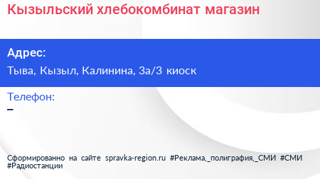Кызыльский хлебокомбинат, магазин по адресу Тыва, Кызыл, Калинина, 3а/3 киоск в дальнейшем Организация, размещена в следующих категориях: