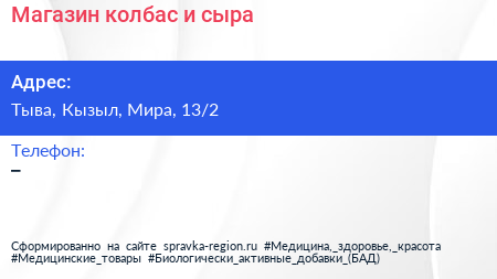 Магазин колбас и сыра по адресу Тыва, Кызыл, Мира, 13/2 в дальнейшем Организация, размещена в следующих категориях: