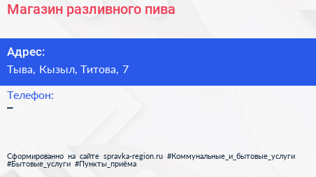 Магазин разливного пива по адресу Тыва, Кызыл, Титова, 7 в дальнейшем Организация, размещена в следующих категориях: